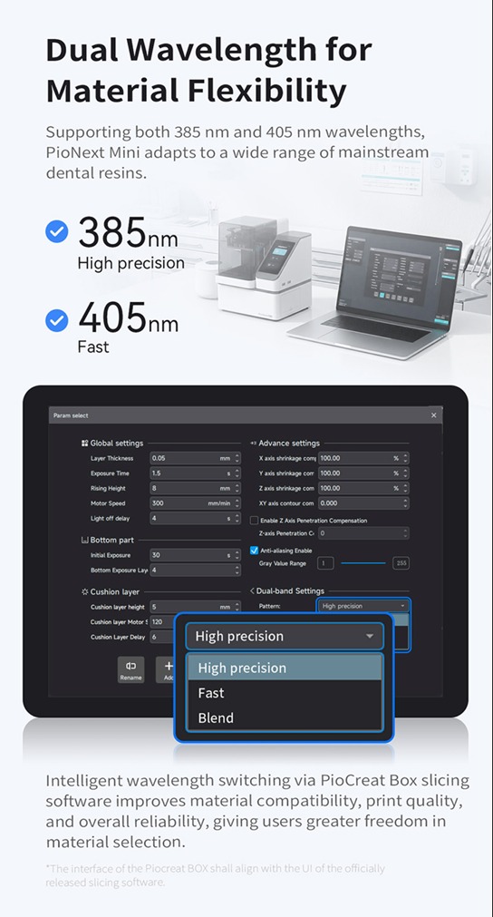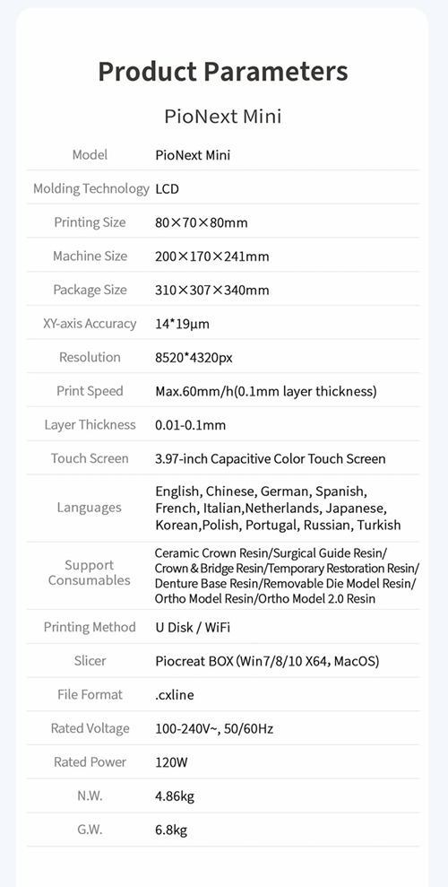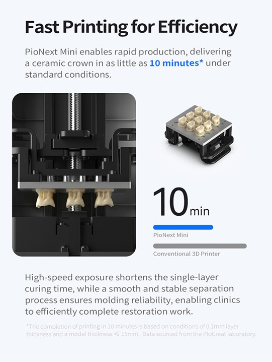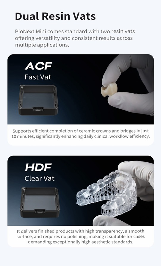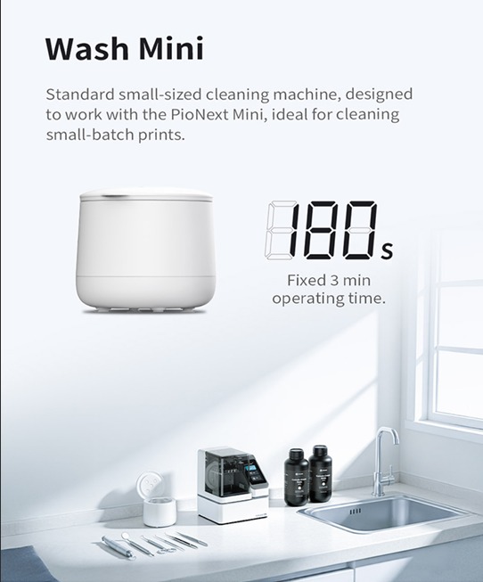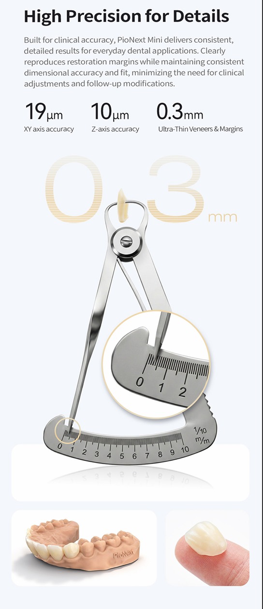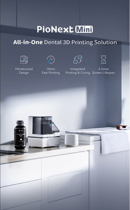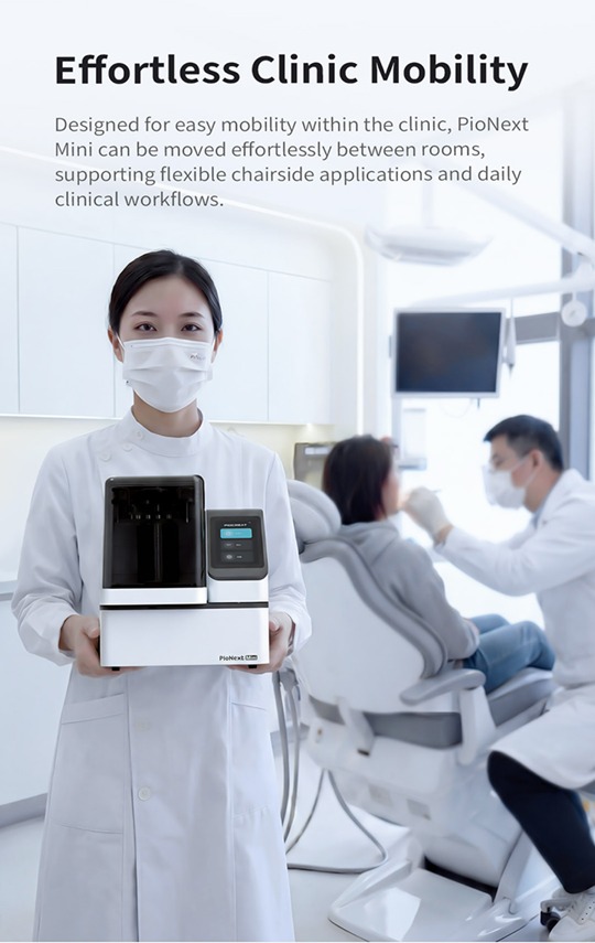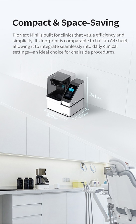 PioNext Mini este o soluție completă all-in-one pentru printare 3D dentară, concepută pentru eficiență maximă în cabinet sau laborator. Sistemul integrează procesul de printare, curățare și polimerizare într-un flux digital optimizat, reducând semnificativ timpul de realizare al lucrărilor dentare.