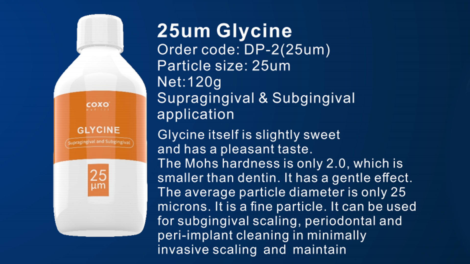 Pudra de profilaxie cu glicină 25μm este recomandată pentru curățare delicată atât supragingivală, cât și subgingivală, fiind ideală pentru tratamente parodontale și întreținere.