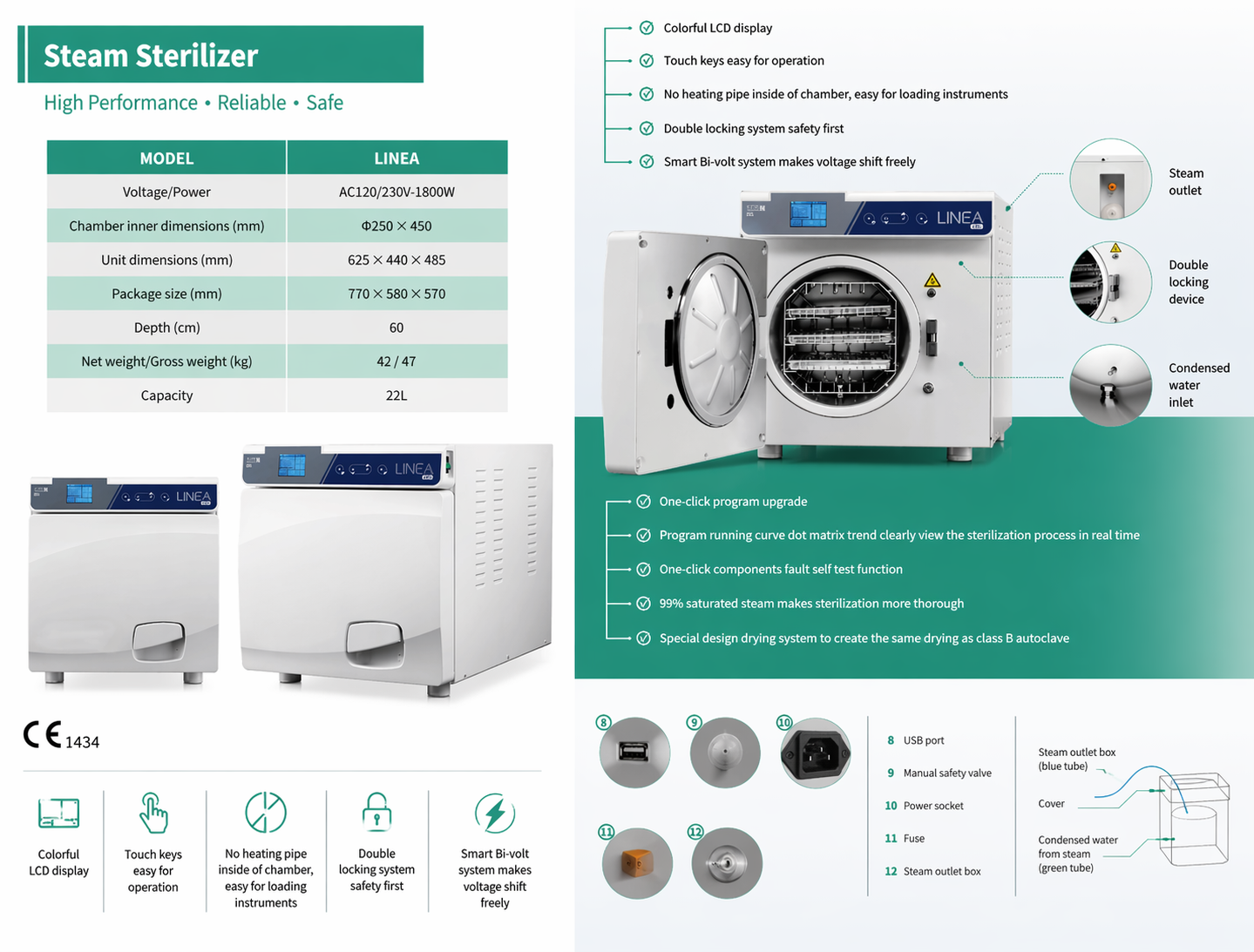 Autoclav Linea 22L este o soluție profesională de sterilizare cu abur, concepută pentru siguranță maximă, eficiență ridicată și operare simplificată în cabinete și clinici moderne.